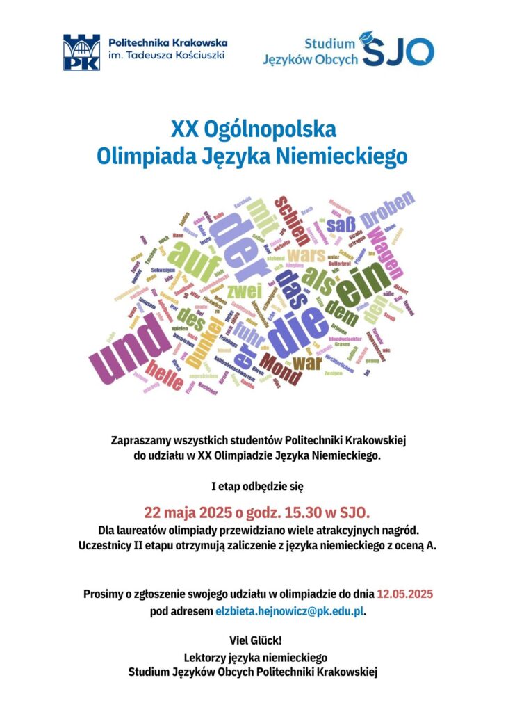 Zapraszamy wszystkich studentów Politechniki Krakowskiej do udziału w XX Olimpiadzie Języka Niemieckiego.